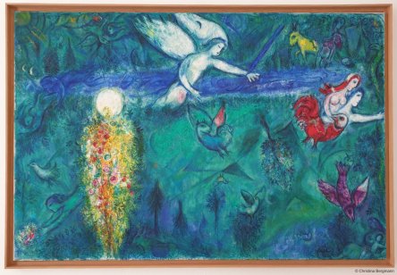 The explanation given with the “Banishment from Paradise”, however, I found interesting. Chagall included some lighter elements in his work – indicating that the expulsion of Adam and Eve was not a tragic event. Consciousness and free will, after all, is something we cherish today. So maybe the rule to not eat a fruit from the tree of knowledge of good and evil was meant to be broken in the first place.